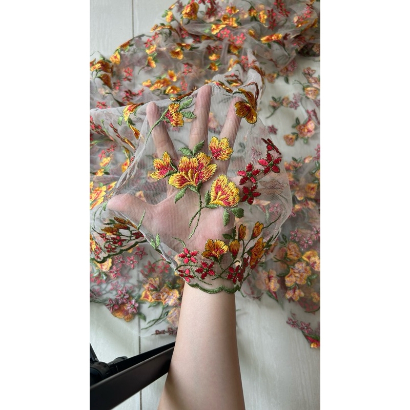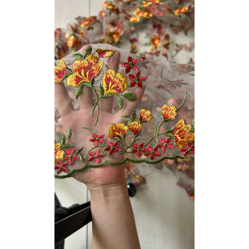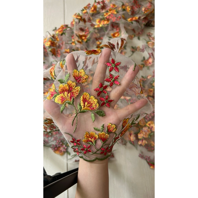Vải ren (SLx0.5m khổ 1.4m) thêu bông cam đỏ